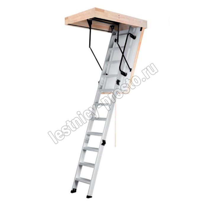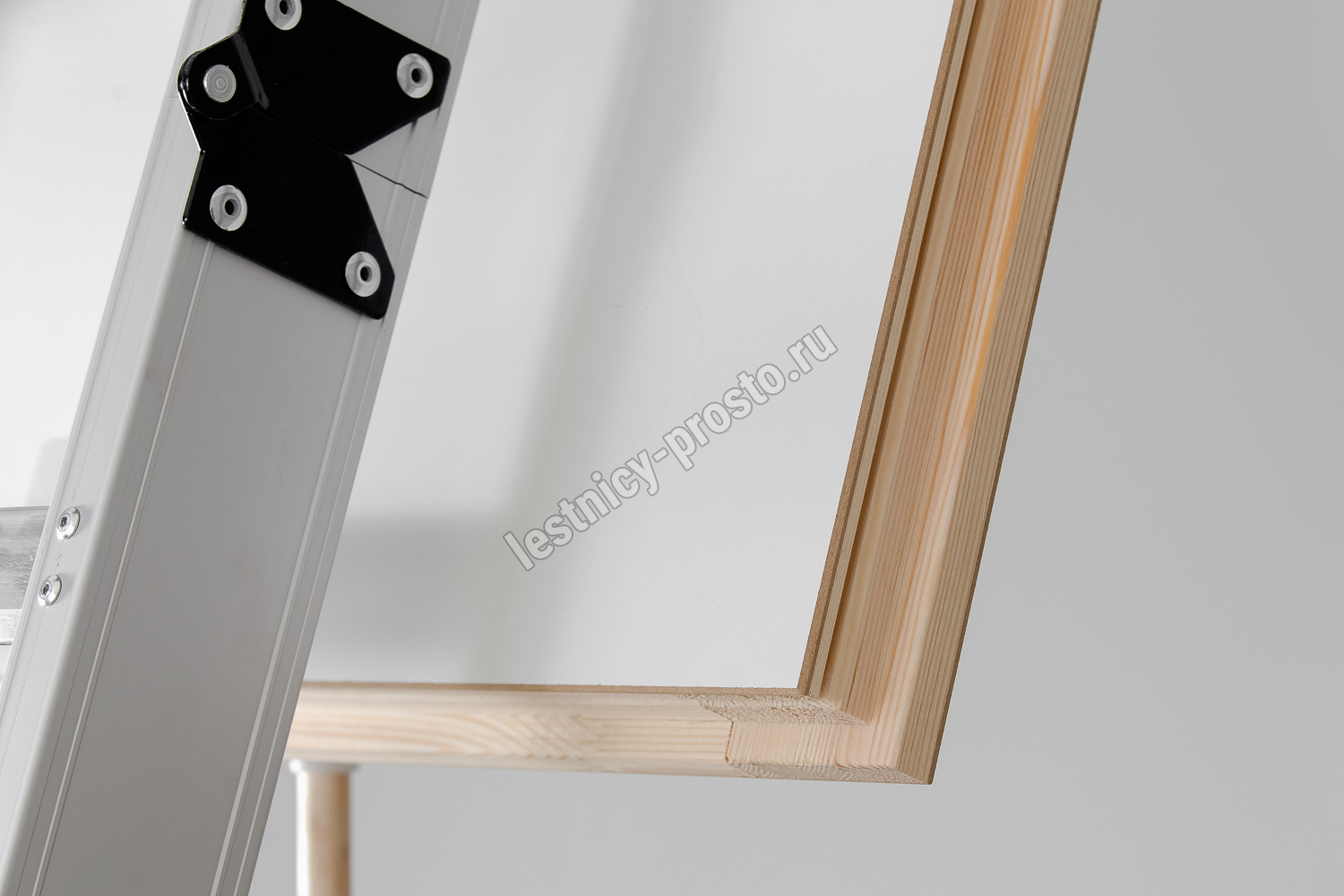 Складная 3-х секционная (до 2800 мм) или 4-х секционная (до 3500 мм) чердачная лестница. Рабочая поверхность полностью выполнена из алюминия. Термоизоляционная крышка типа "сэндвич" имеет усиленную теплозащиту, облицована с двух сторон ДВП белого цвета. По контуру короба имеется уплотнитель;