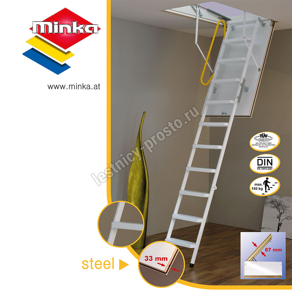 Износоустойчивая лестница для холодных помещений, приспособлена, как для частого использования так и для продолжительного простаивания. Белый цвет крышки люка (толщина 3,3 см) гармонично интегрируется в интерьер помещения и закрывается, маскируясь в один уровень с потолком.