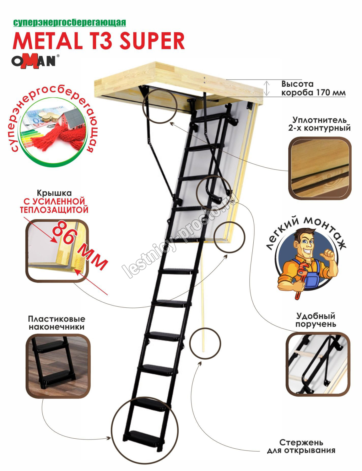 Чердачная лестница OMAN Metal T3 SUPER 60×113 см, h-280 см