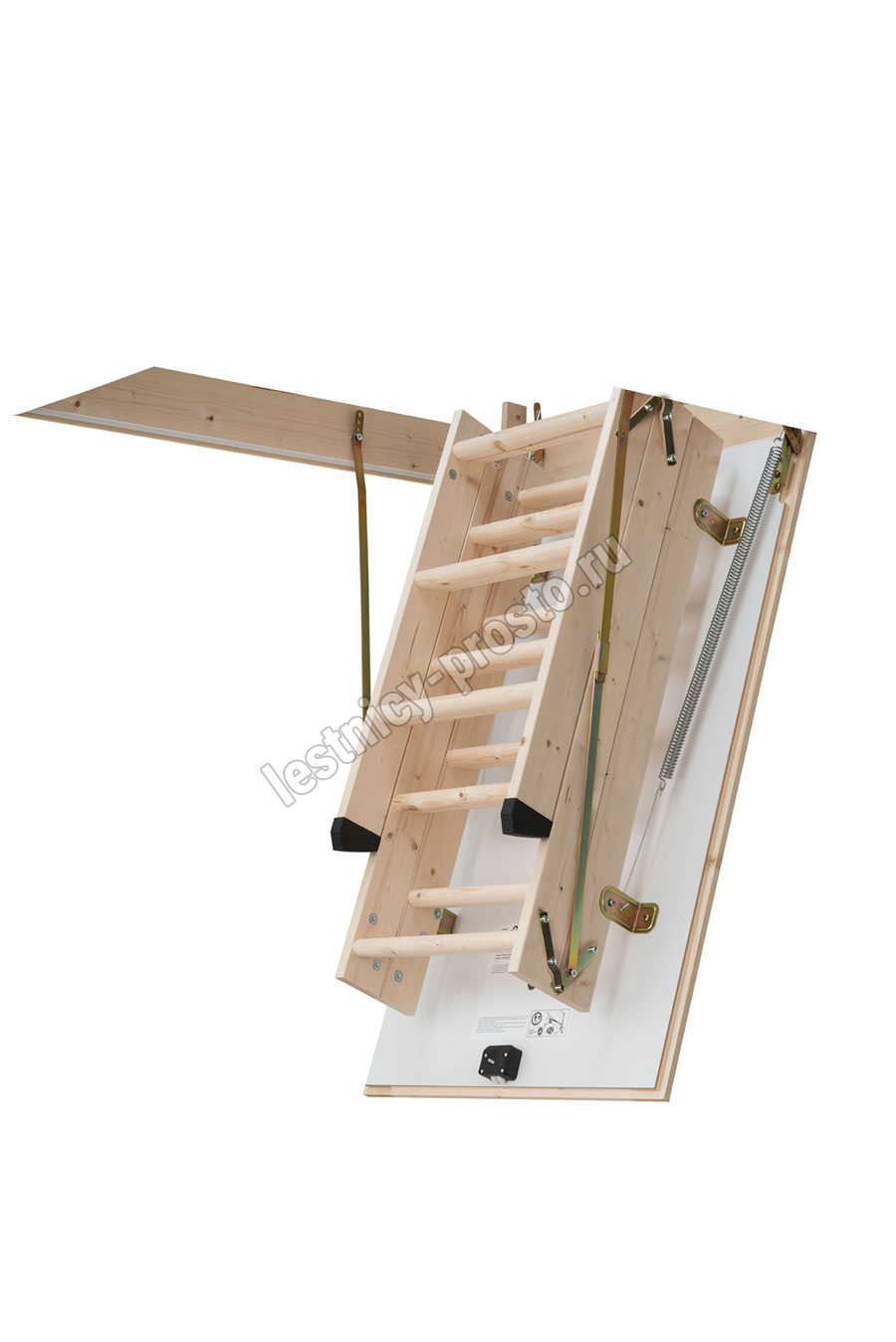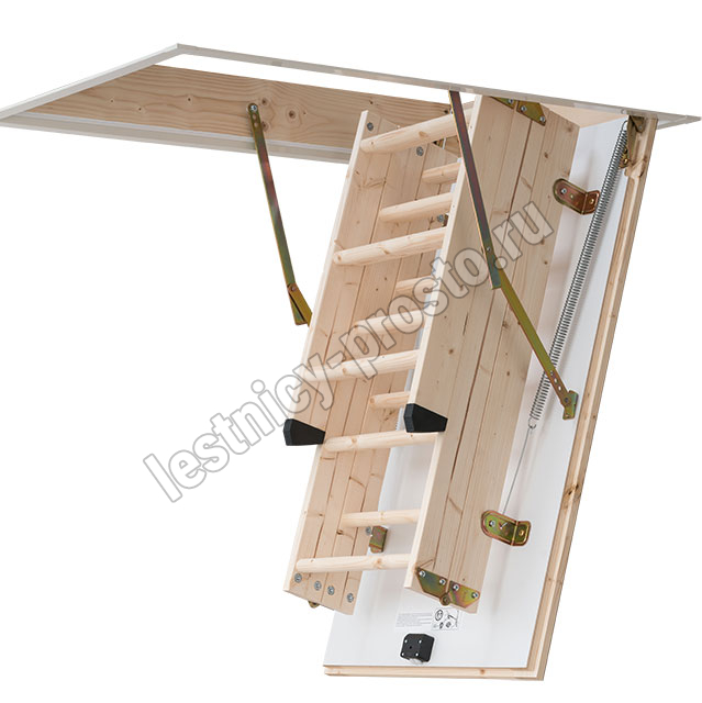 PROF 36 - трехсекционная утепленная лестница из скандинавской медленнорастущей ели, отличающейся повышенной прочностью, ступени из сосны, имеют антискользящие насечки. Лестница оснащена поворотным замком, надежно фиксирующим люк в закрытом состоянии. Высоту базовой модели можно увеличить при помощи дополнительной секции до 3500 мм. Размер короба: 1175х676 мм