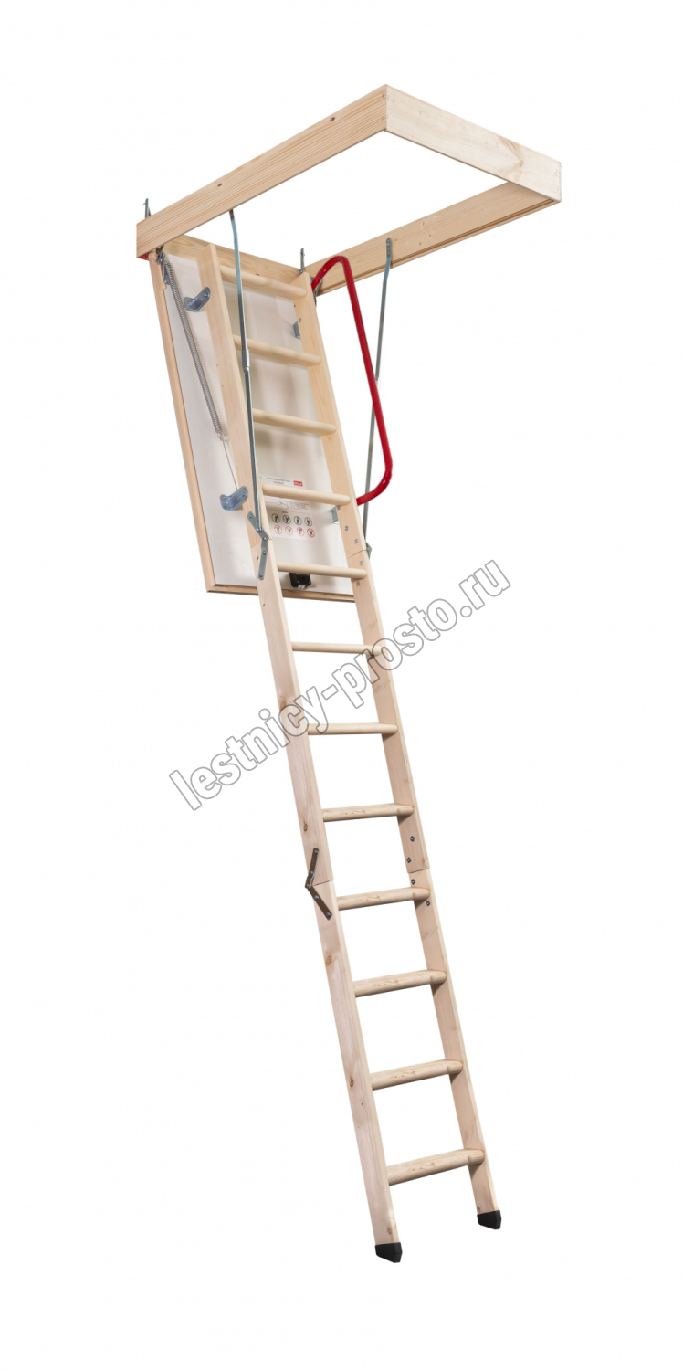 В изготовлении лестницы используется дерево хвойных пород. Лестница оснащена утепленным двусторонним белым люком, который практически не заметен на потолке. В случае необходимости крышку люка можно перекрасить в любой другой, подходящий для интерьера цвет.