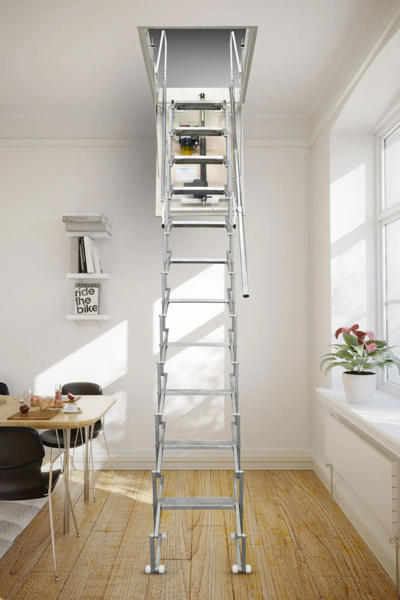 Лестница складная трехсекционная. Рабочая поверхность полностью выполнена из металла и покрашена порошковой краской. Термоизоляционная крышка типа "сэндвич", толщиной 47 мм, утеплена пенопластом, облицована с двух сторон ДCП белого цвета.
