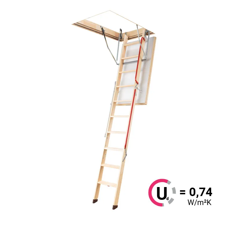 Лестница раздвижная двухсекционная, изготовлена из сосны. Термоизоляционная крышка типа "сэндвич" имеет усиленную теплозащиту, облицована с двух сторон ДСП белого цвета. По контуру короба имеется уплотнитель. Все металлические элементы лестницы покрыты порошковой краской, ступени лестницы имеют антискользящие насечки и закреплены в столярное соединение «ласточкин хвост», что позволяет выдерживать нагрузку 150 кг. При раскладывании лестницы нет вылета за пределы короба, что позволяет использовать эту модель лестницы в таких помещениях, где невозможно использовать чердачные лестницы с большим разбегом открытия. Удобна для эксплуатации на большой высоте. Деревянный стержень для открывания лестницы в комплекте..