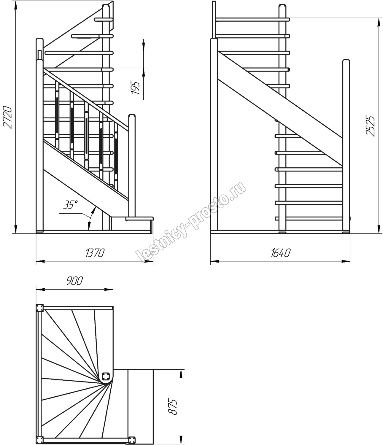 Деревянная межэтажная лестница ЛЕС-03 2525-2720 проем 1640-900, Лиственница