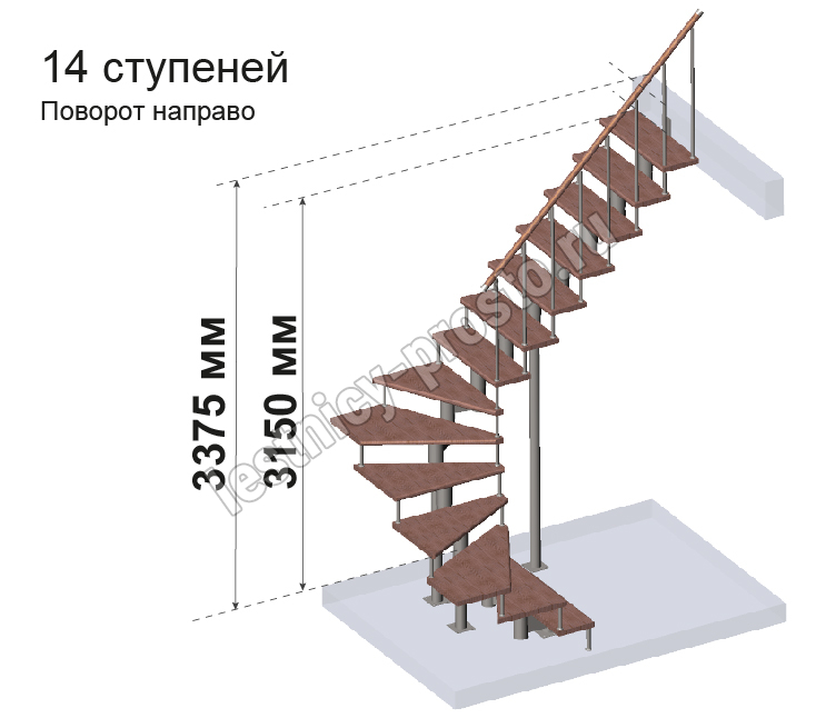 Готовый комплект ограждений с крашеными стойками собран специально для п-образной модульной лестницы PROSTO MODULE h337.5 (из 14 ступеней).