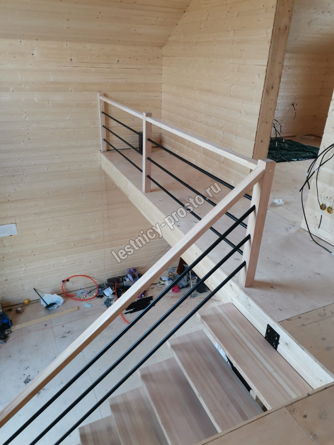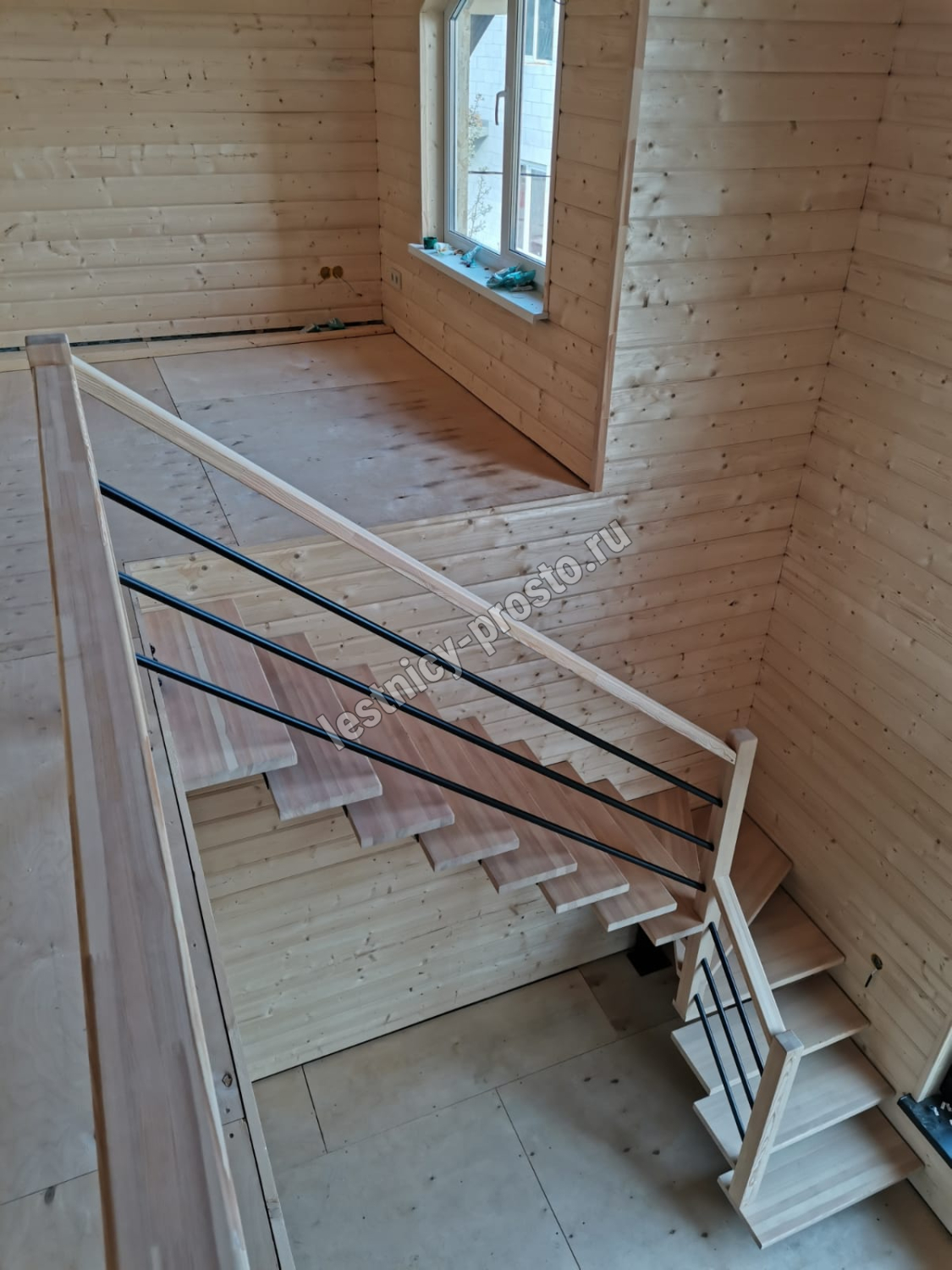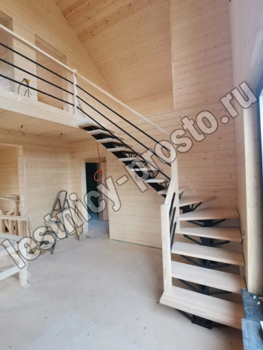 Лестница PROSTO MONO STEP TRINITY г-образная забежная, ступени берёза с ограждением