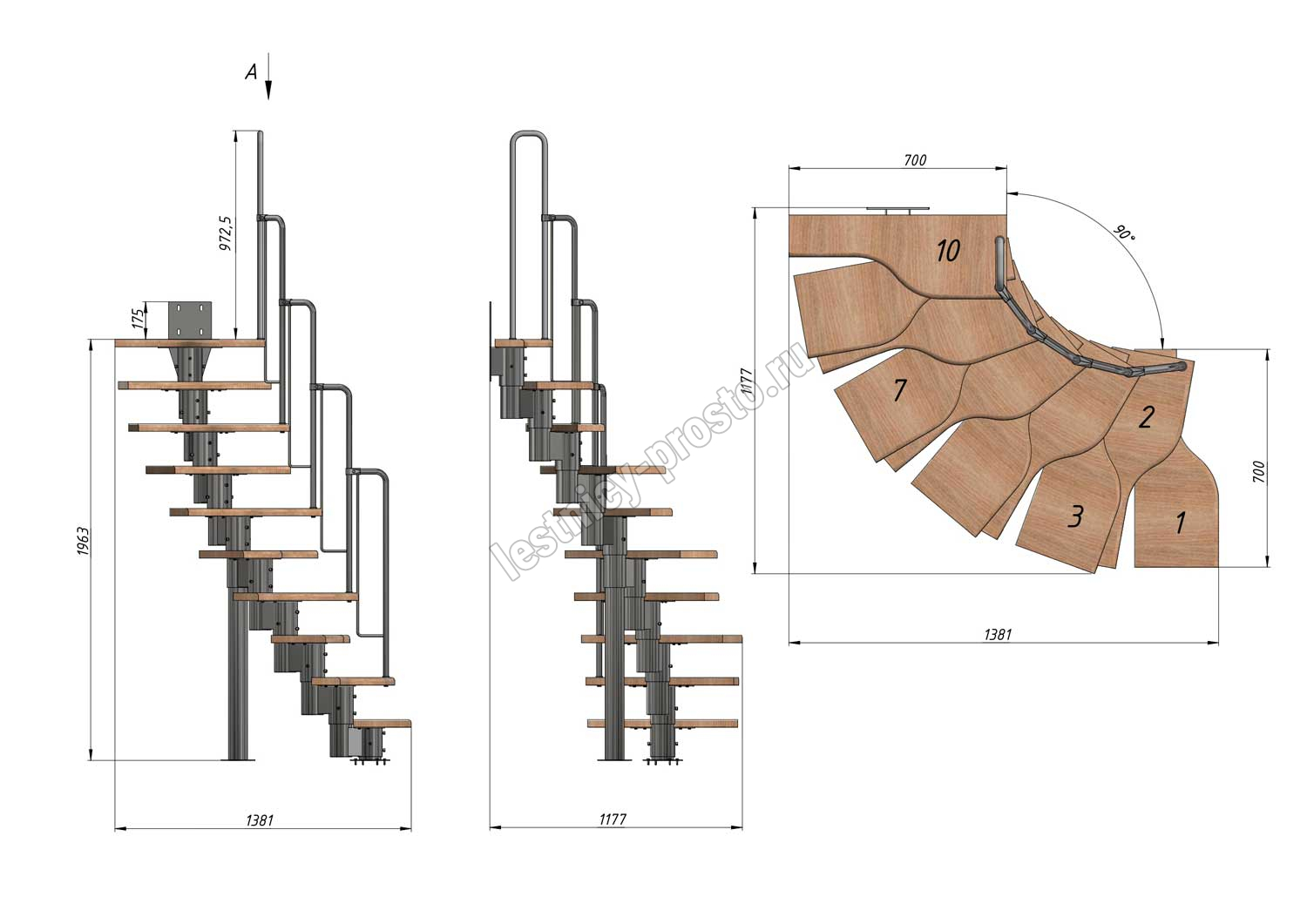 Лестница Prosto Urban Black гусиный шаг 700 мм, h180-264 см (10 ступеней), бук