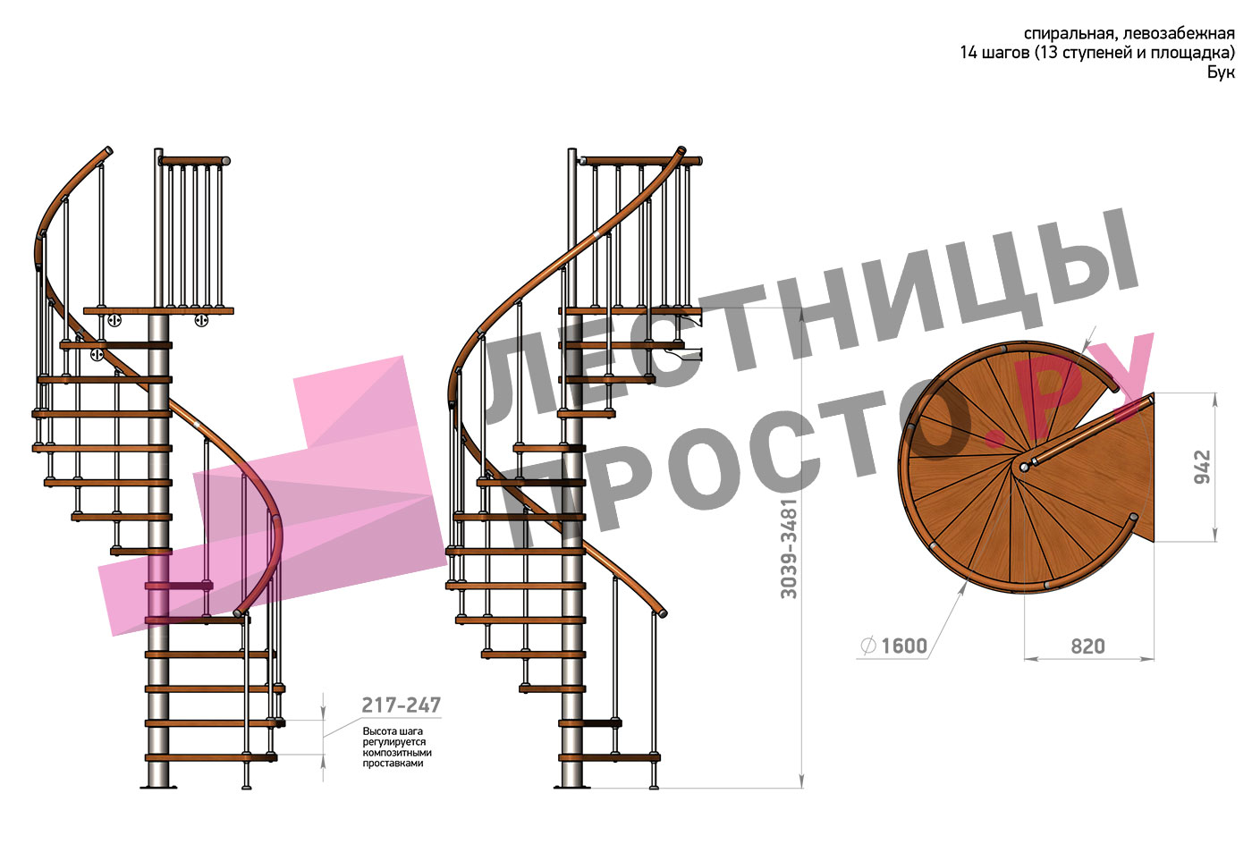 Высота лестницы 3039 - 3481 (13 ступеней) мм