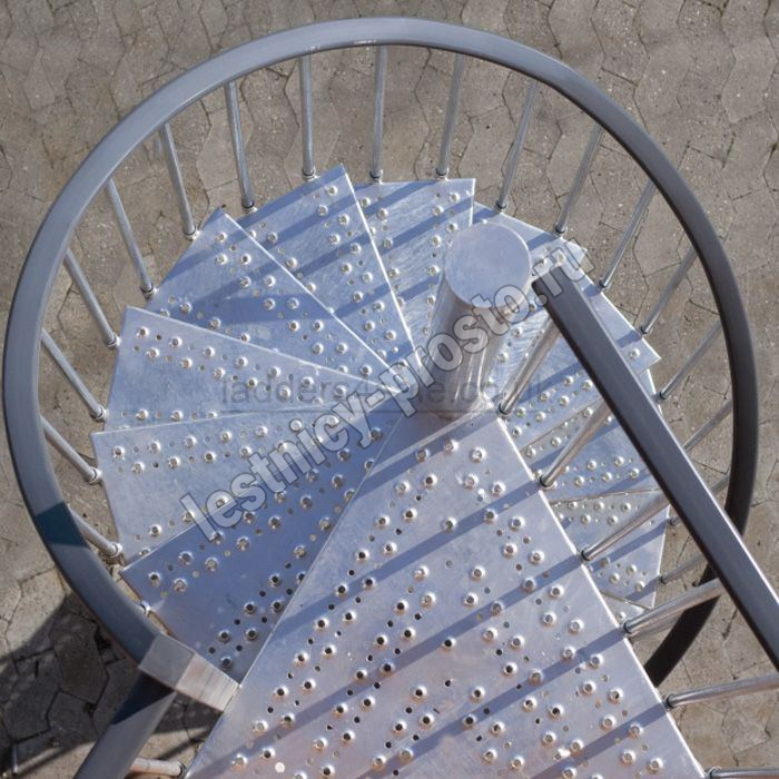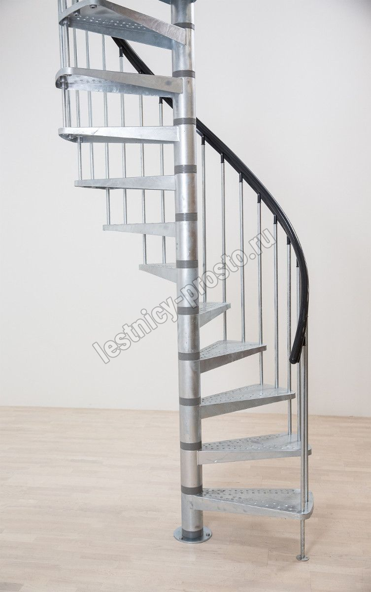 Металлическая винтовая лестница с металлическим поручнем и площадкой. Лестница монтируется как по часовой стрелке, так и против нее. Предназначена для использования внутри помещения или снаружи. На ступенях противоскользящие насечки. Лестница изготовлена из оцинкованной стали.