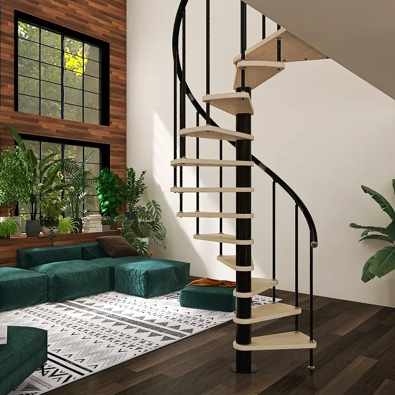 Ступени лестницы изготовлены из бука по технологии MULTIPLEX и покрыты износостойким защитным лаком. Лестница монтируется как по часовой стрелке, так и против. Возможен монтаж в круглый или квадратный проём. Ограждение: стальные трубки, Ø25 мм RAL 7016. Поручень: гибкий цельный ПВХ-поручень Ø40 мм антрацитового цвета. Конструкция и балюстрада окрашены порошковым способом в антрацитовый цвет (RAL 7016).